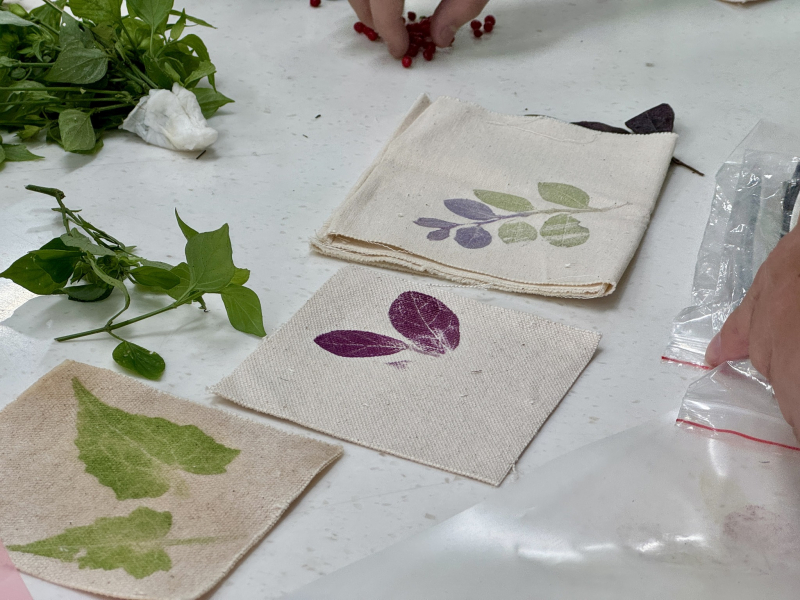 孩子們用點力氣,將植物的色彩與紋路拓印在布料上,